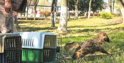 | 获救助的貉奔向山林。 王圣凯 摄 |