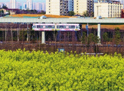 旁边的空轨,不时有粉色主题的樱花专列驶过,科技与浪漫的融合将氛围感拉满。