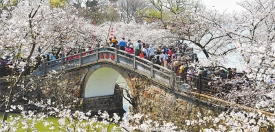 | 3月25日,游客在江苏无锡太湖鼋头渚景区赏樱游玩。 新华社发 |