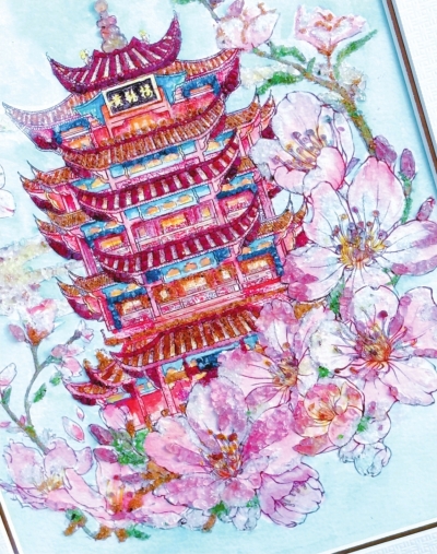 | 樱花和黄鹤楼画面上镶嵌着宝石,宝石和水彩融为一体。 |