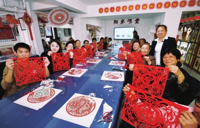 | 社区居民在非遗体验馆学习剪纸技艺。 |