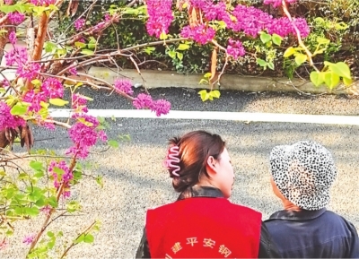 | 《咔嚓!这份春日关怀已存档》 作者:黄雅轩(24岁) 作品介绍:社区志愿者陪伴小区老人赏花。 作品拍摄于:钢花村街道110社区45门前 |