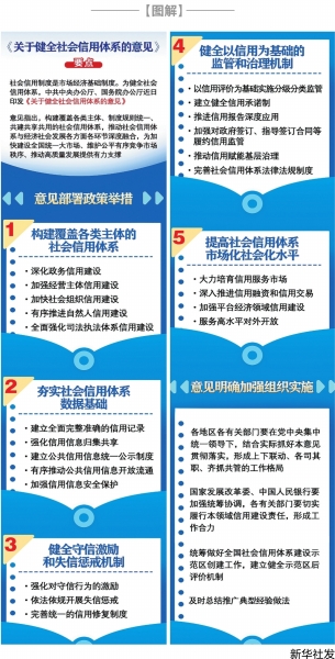 意见部署了23项政策举措,涉及构建覆盖各类主体的社会信用体系、夯实社会信用体系数据基础、健全守信激励和失信惩戒机制、健全以信用为基础的监管和治理机制、提高社会信用体系市场化社会化水平等5个方面。