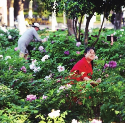 | 4月7日,华中科技大学韵苑牡丹园和青年园的千株牡丹花盛开,师生们足不出“户”可欣赏“国色天香”之美,感受着牡丹的芬芳与美丽。 记者高勇 摄 |