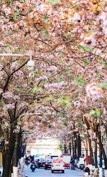 泡桐树是湖北的一类乡土树种,主要分布于农村地区,城区较为少见。江汉区仅有八古墩东一巷和福利路将泡桐树选作行道树。由于前期武汉气温较高,今年泡桐花的花期有所提前,清明前后才到盛花期,天气晴好时拍出来的效果最好。泡桐树的树形舒展,树冠丰满,花色通常为紫色或白色,花冠硕大,江汉区这两条街道两侧均为紫色泡桐花,更具观赏性。此外,根据道路条件和植株生长情况,紫色的纯度有所不同。