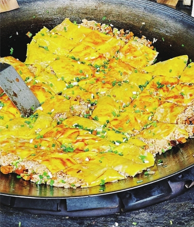 铲子在蛋皮上划出金黄的漩涡,糯米、香菇、干子在铁板上跳舞。