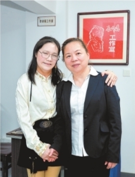 | 老师彭艳华(右)和李诗瑶在工作室合影。 |