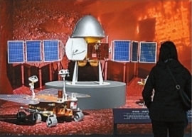 | 展出的天问一号环绕器模型(中)。 |