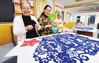| 花城社区“凤雅霞君阁工艺组"的大妈在共享空间剪纸。 |