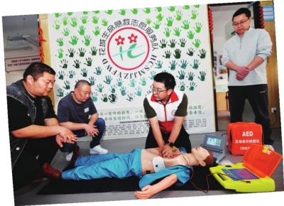 | 社区居民瞿义广(右二)在教授社区居民急救方法。他曾连续三届担任武汉马拉松急救跑者,也是花城生命急救志愿服务队队长。 |