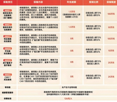 “福汉康”紧密衔接基本医保,涵盖医保目录内住院费用(含门慢特)、医保目录外住院费用、特定高额药品费用、罕见病药品费用、质子重离子医疗费用、CAR-T药品费用,六项保障责任,医保报完还能继续补充报销。