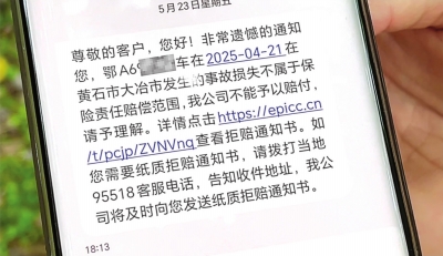 | 拒赔短信。 记者尹勤兵 摄 |