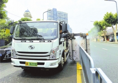 | 环卫工人驾驶护栏车清洗护栏。 记者陶常宁 摄 |