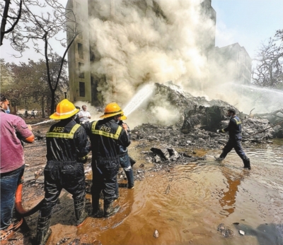| 消防员在印度古吉拉特邦飞机坠毁现场灭火。 |