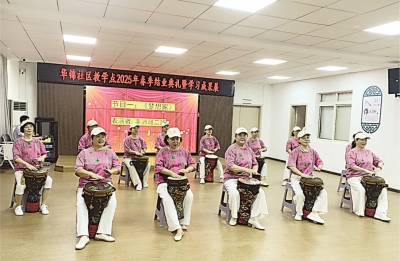 | 华锦社区的居民学员集体表演非洲鼓。 社区供图 |
