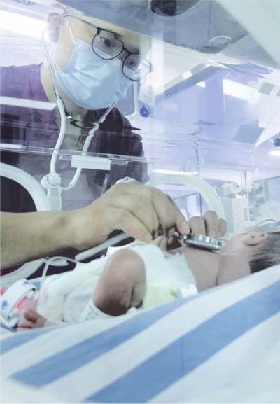 | 新生儿内科副主任医师袁文浩正在为早产儿做检查。 通讯员江梦 摄 |