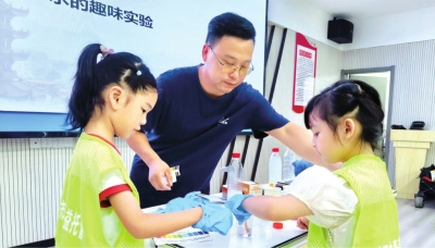 活动中,老师采用跨学科的方式带来“河湖长制下的生态协奏曲”,引导孩子们用跨学科视角重新认识水的价值和文化。最受欢迎的是化学实验环节,当看到pH试纸在水样中变幻出不同颜色时,孩子们发出阵阵惊呼声。接着,在老师的带领下尝试用一张纸巾过滤脏水,孩子们自告奋勇积极体验。最后的魔术表演更是将气氛推到了高潮,老师用“消失的水”和“会变色的茶水”两个魔术,让孩子们在欢笑中认识到水资源的珍贵。