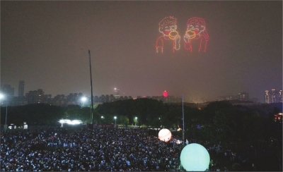 | 园博园夜晚上演“无人机吃月饼”。 通讯员徐志刚供图 |