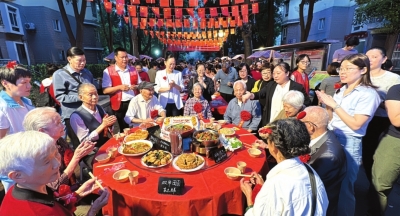 红烧排骨色泽诱人、手工饺子饱含心意、梅菜扣肉香气扑鼻……由社区居民、商户共同参与制作的百余道家常菜摆满长桌。10位高龄老人代表“同庆生”。“每年都盼着社区的团圆宴活动,今年不仅吃得开心、玩得尽兴,还买到了实惠的助农产品,太满足了!”居民王阿姨的话道出了大家的心声。