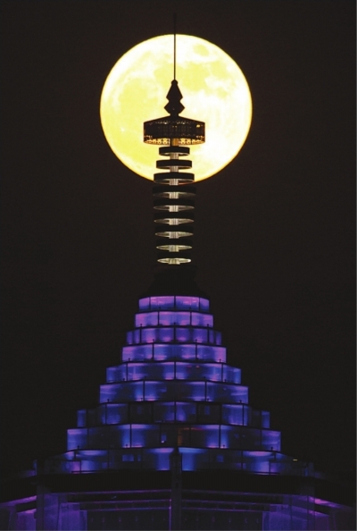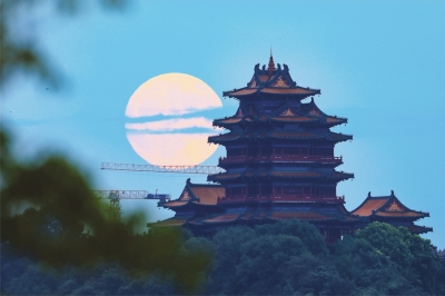 | 2024年9月17日,圆月与南京阅江楼相映成趣。 |