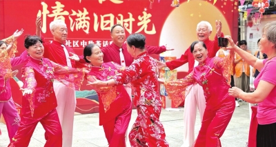 “花篮的花儿香,听我来唱一唱”……近日,在洪山区卓刀泉街道五环社区,一场以“月满华诞,情暖旧时光”为主题的迎中秋、庆国庆怀旧茶话会启幕。活动以“互动+怀旧”为主线,将节目表演与趣味游戏穿插进行,让每个人都成为节日的参与者。“花好月圆”主题分小组对歌环节,六组居民分别围绕指定的“花”“好”“月”“圆”汉语接龙演唱,十余名阿姨齐声合唱《南泥湾》片段。节目均由社区学校学员自编自演。现场,武汉民政学院学生还带来茶艺展示。