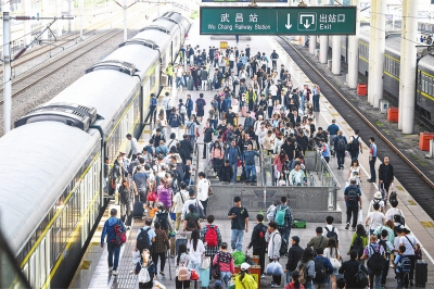 10月7日,武昌火车站迎来返程高峰,当天发送旅客6.4万人次,到达10.8万人次。铁路国庆中秋双节假期运输自9月29日启动,至10月10日结束,为期12天。中国铁路武汉局集团有限公司实行高峰运行图,计划加开2582列始发旅客列车,预计发送旅客约1000万人次,日均约88万人次,同比增长3%左右。