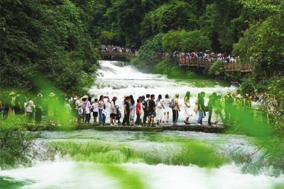 | 3日,人们在贵州荔波县小七孔景区观光游玩。 |