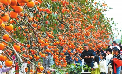 | 10月19日,市民和游客在四川省乐山市五通桥区汤家坝村观赏柿子树。 新华社发 |