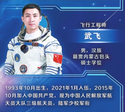 武飞出生于1993年10月,是目前我国航天员队伍中最年轻的航天员,曾任中国航天科技集团有限公司工程师。2020年9月,作为航天飞行工程师入选为我国第三批航天员。