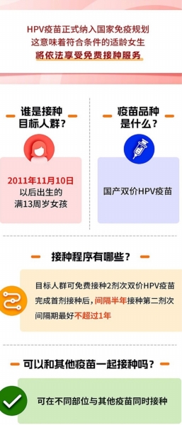 经国务院同意,我国在现行国家免疫规划疫苗基础上,将人乳头瘤病毒(HPV)疫苗纳入国家免疫规划,为2011年11月10日以后出生的满13周岁女孩,免费接种2剂次针对16和18基因型病毒的双价HPV疫苗(间隔6个月)。