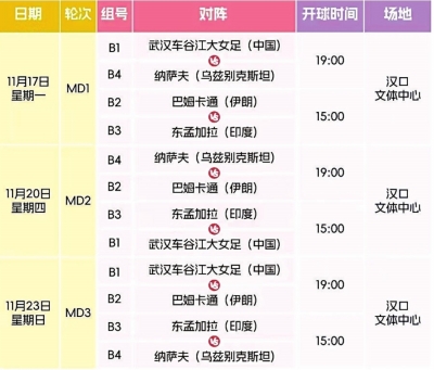 揭幕战定于11月17日15时在汉口文体中心举行,由巴姆卡通女足(伊朗)对阵东孟加拉女足(印度)。当日19时,武汉车谷江大女足将坐镇主场,迎战乌兹别克斯坦的纳萨夫女足,正式开启新一届女足亚冠征程。