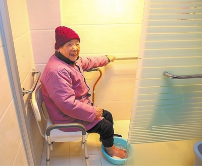 | 常州市居民钱金秀老人在经过适老化改造的卫生间内洗脚。 新华社发 |