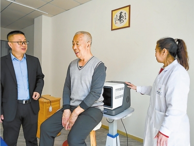| 吉林四平市社区助老员与同事为老人试用理疗仪。 新华社发 |