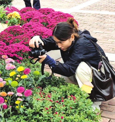 | 游客在中山公园专注拍摄乒乓菊。 记者明眺生 摄 |