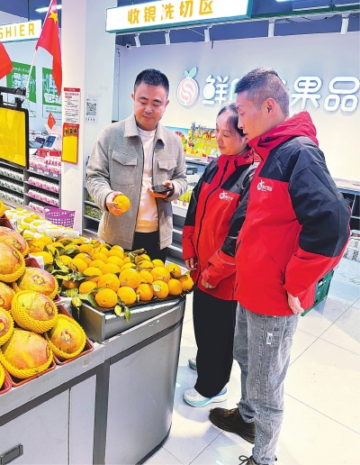 | 王冲指导员工辨别水果好坏,并提醒及时处理。 社区供图 |