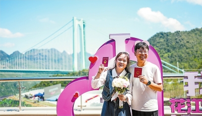 | 9月28日,世界第一高桥——贵州花江峡谷大桥建成通车,设立在大桥旁云渡服务区的婚姻登记巡回点也正式启用。 新华社发 |