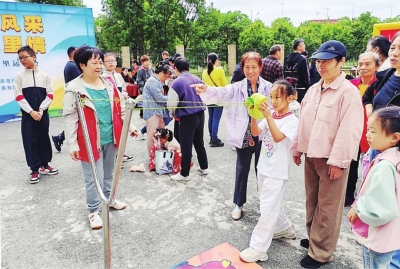 | 社区邻里运动会上,居民正参与趣味投篮项目。 |