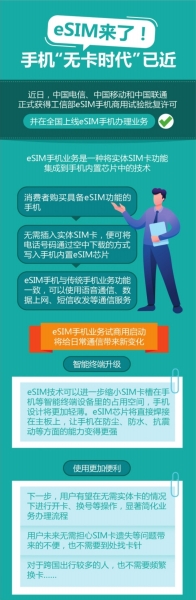 eSIM不仅取消手机卡槽,更带来终端设计、用户体验和连接方式的革命性变化。中国移动上海公司市场经营部副总经理肖敏莉向记者解释说:“通过空中写卡的方式,把号码信息写到手机的内置芯片里,终端可以不用插入实体SIM卡。”