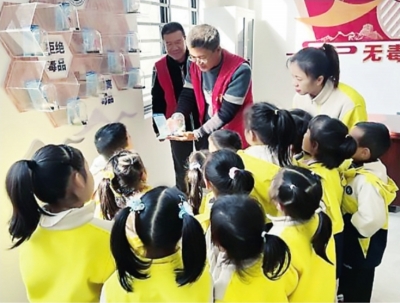 近日,新洲区邾城街道旭新社区禁毒教育基地迎来都市花园幼儿园的30余名小朋友。社区禁毒志愿者通过趣味化、具象化的互动形式,为孩子们打造了一场别开生面的禁毒启蒙课。
