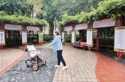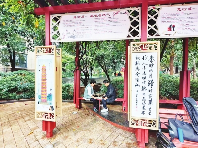 | 居民在改造后的清风广场旁的文化长廊下棋。 |