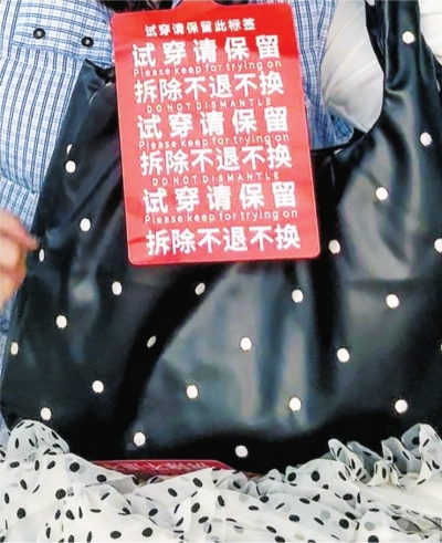 商家表示,做服装生意多年,在和顾客的多番”斗智斗勇”之下,才选择了如此硬核的“物理防御”。“去年被客人穿过又退回来的衣服,让我损失了好几千,今年同样也有这样的情况,退回来的衣服上都是洗衣液的味道。为了防‘蹭穿’,我也用过巨型吊牌,但成本就要8元左右,而且并没有什么效果。”