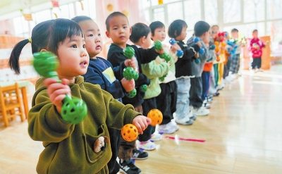 | 近日,山东省邹平市幼儿园托育班的小朋友在做摇铃操。 新华社发 |