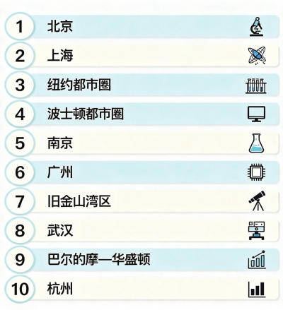 全球科研城市十强依次为北京、上海、纽约都市圈、波士顿都市圈、南京、广州、旧金山湾区、武汉、巴尔的摩—华盛顿和杭州。