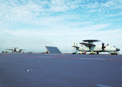 日前,海军福建舰开展入列后首次海上实兵训练。这是空警-600舰载固定翼预警机接续弹射起飞。