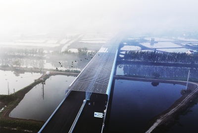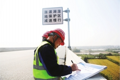 这是万里长江桥梁建设中首次为保护鸟类专门设置全封闭式声屏障,长400米、高6.38米、横跨34米,它能将交通噪声“包裹”起来,有效降低对周边野生动物,特别是对声音敏感的鸟类的惊扰。