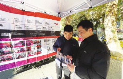 汉阳市政集团的展台围绕“电梯加装”展开,工作人员盛捷详细解读最新政策,一步步讲解加装流程,回应居民关切。“我们楼正在征求意见,今天听了讲解,心里有底了。”居民刘建季满意地说。电梯品牌方蒂升工作人员雷远鹏向居民详细介绍电梯更新的政策。