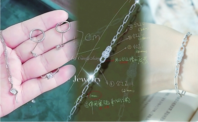 | 张女士的旧首饰(左);改造设计图(中);改造后的手链(右)。 受访者供图 |