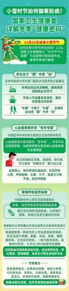 11月22日迎来小雪节气。随着小雪的到来,北方寒风渐起,南方阴冷潮湿,冬季健康话题成为公众关注焦点。如何在寒冷季节养生防病?近日,国家卫生健康委以“时令节气与健康”为主题举行新闻发布会,邀请专家进行解答。