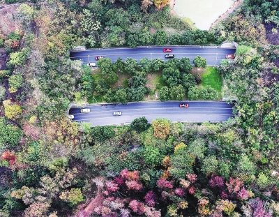 我市进入初冬季节。连日来,记者用无人机记录下东湖色彩斑斓的景象。图为团山双向隧道。