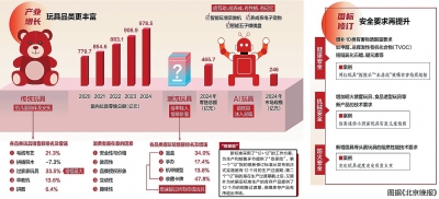 二是玩具产品的种类更丰富,质量标准更健全。近年来,随着新材料、新工艺、新技术的不断应用,我国玩具产品的品种丰富度实现大幅提升,玩具产品质量不断提高,标准体系不断完善。毛绒、布艺、木制、金属、塑胶等各种材质的玩具产品基本实现全覆盖;益智玩具、智能玩具等创新产品引领潮流新趋势;尤其是人工智能及大模型的应用为玩具产品注入新灵魂,显著提升玩具产品交互体验,能互动、能养成、有性格、有记忆的AI玩具深受年轻人喜爱,已成为行业竞争的新赛道。据统计,2024年我国AI玩具市场规模约246亿元,预计2025年全年将增至290亿元。